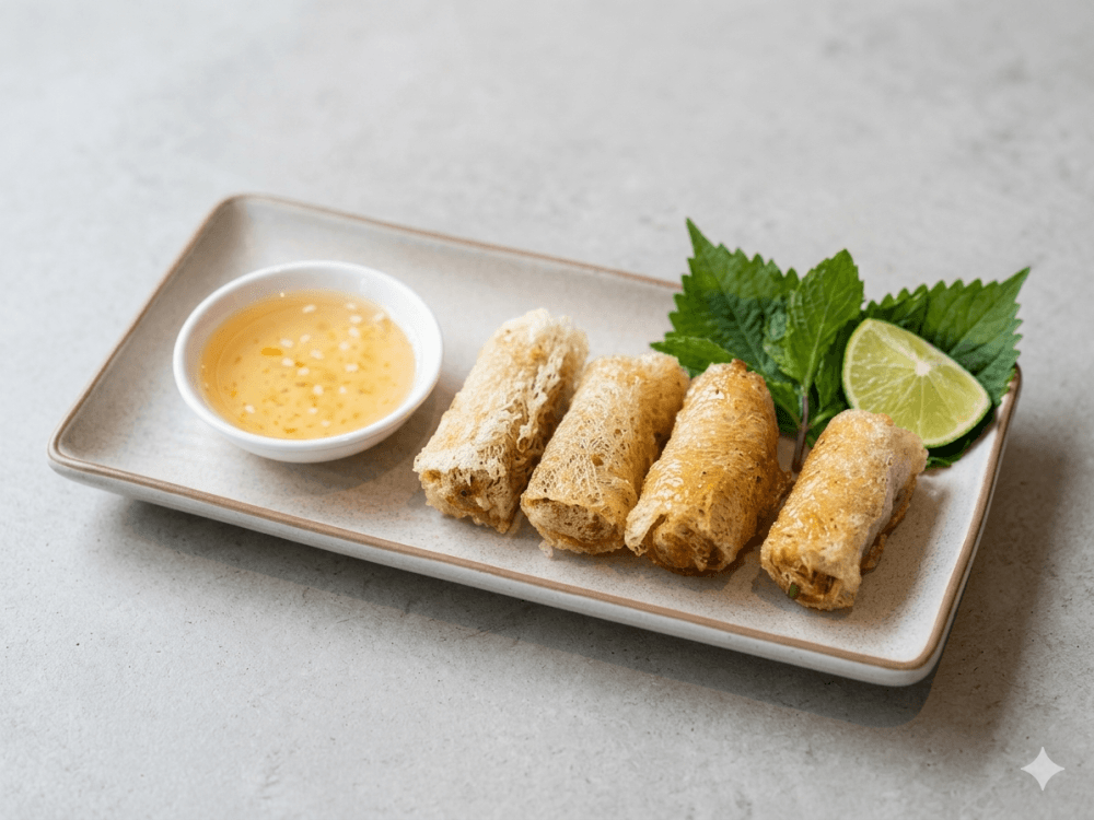 Crispy ricenet wrapped rolls featuring a savory blend of shrimp, fish paste, and crab, mixed with yam bean, taro, black fungus, onion, and garlic. Served with plum sauce.